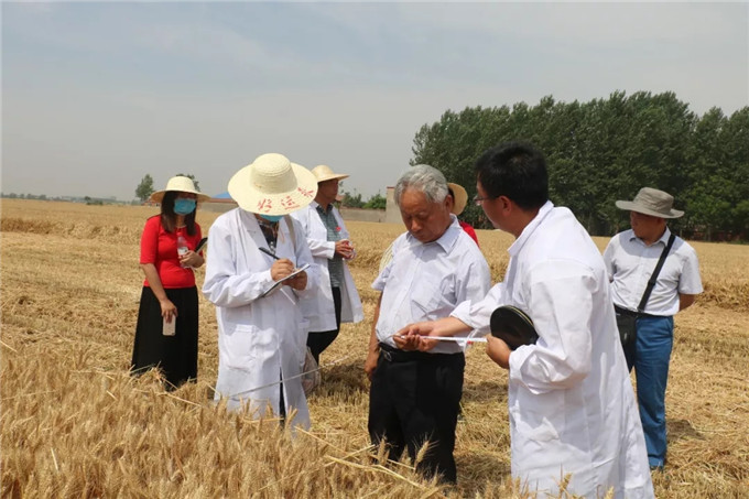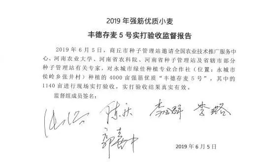 應商丘市種子管理站的邀請,河南農業大學、河南省農科院、河南省種子管理站、商丘市農科院以及部分地市種子管理站的有關專家對永城市綠佳種植專業合作社連片區域化種植的4000余畝強筋優質小麥豐德存麥5號開展驗收,并對位于張井村的1140畝進行實打驗收。