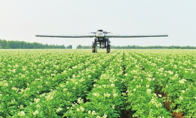 團棵期葉面噴施海藻肥或腐殖酸肥促進發棵,馬鈴薯落蕾后分兩次各沖施10公斤高鉀全水溶肥。結合防病噴藥,可每次添加磷酸二氫鉀100克,防止葉片早衰。