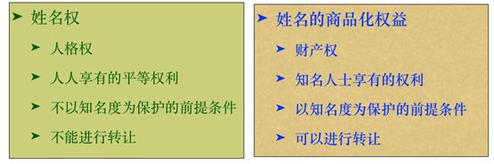 姓名的商品化就是自然人基于自己的聲望進行商業化開發而獲得利益的行為。對于具有市場價值的自然人姓名,不再是立足于民法意義上的人身權保護,而是作為商業標識進行保護,這就是姓名的商品化權益。我國目前對應這種權益的法律保護沒有明文規定,但由于經濟發展確有必要進行保護,因此主流觀點將其稱為姓名的商品化權益,而不是稱之為商品化權。與姓名權相對比,姓名的商品化權益的基本特點如圖3所示。