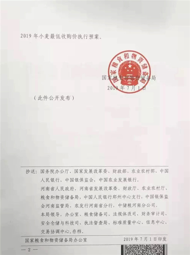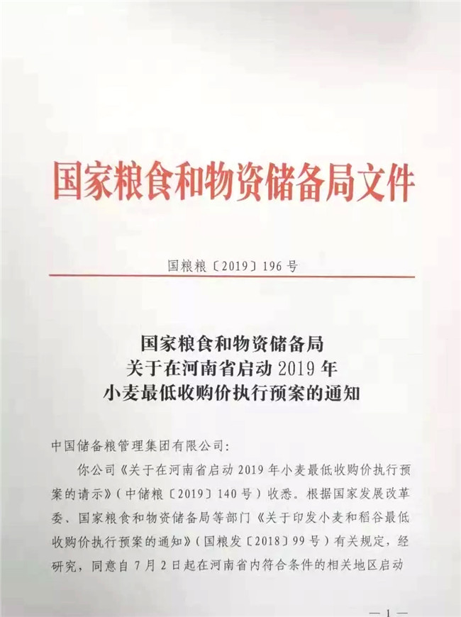 根據國家發展改革委、國家糧食和物資儲備局等部門《關于印發小麥和稻谷最低收購價執行預案的通知》(國糧發〔2018〕99號)有關規定,經研究,同意自7月2日起在河南省內符合條件的相關地區啟動2019年小麥最低收購價執行預案。
