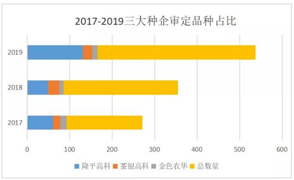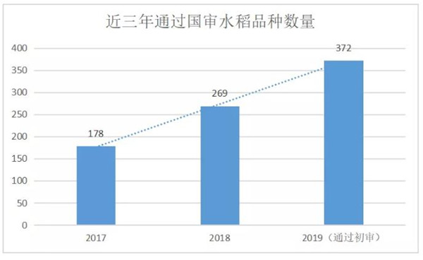 2016年國家首次審定水稻綠色通道試驗品種以來,2017年國家審定水稻品種便達到了178個(詳細分析請戳 → 競爭慘烈!178個國審稻“沖”進市場,誰將成為最大贏家?),2018年達到269個,今年更是突破“三”字大關。在近期農業農村部公布的2019年國家農作物初審通過品種名單中,372個水稻品種通過初審,今年國審品種注定會是歷年來數量最多的一年。
