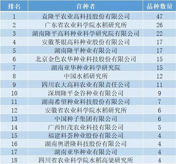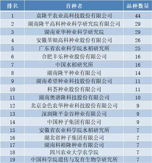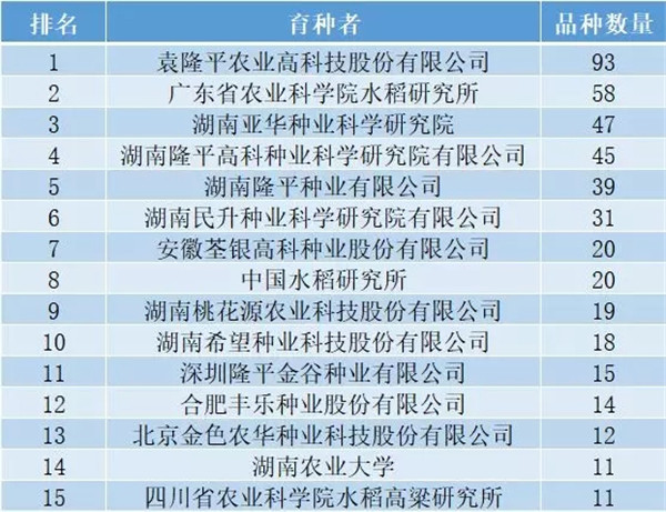 其中,2019年初審名單中,隆平高科系繼續一枝獨秀,自主選育和與科研單位合作選育水稻新品種131個,占總品種數的35.2%,是此次通過初審品種最多的選育單位。