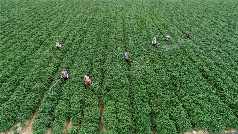 8月7日,在河南省光山縣椿樹崗村天隆農業蔚藍合作社紅薯種植基地內,社員們正在地里給紅薯秧苗噴施葉面肥。立秋節氣將至,隨著氣溫下降,該合作社的社員們抓緊給紅薯秧苗噴施葉面肥、除草等管理工作,田間地頭一派繁忙景象。據介紹,該合作社今夏引進種植了優質品種一點紅、西瓜紅、紫羅蘭、雞骨香等四個品種紅薯500余畝,采取“基地+合作社+農戶”的種植管理模式,預計畝產可達4000多元,已經吸納當地96名村民在家門口實現就業。
