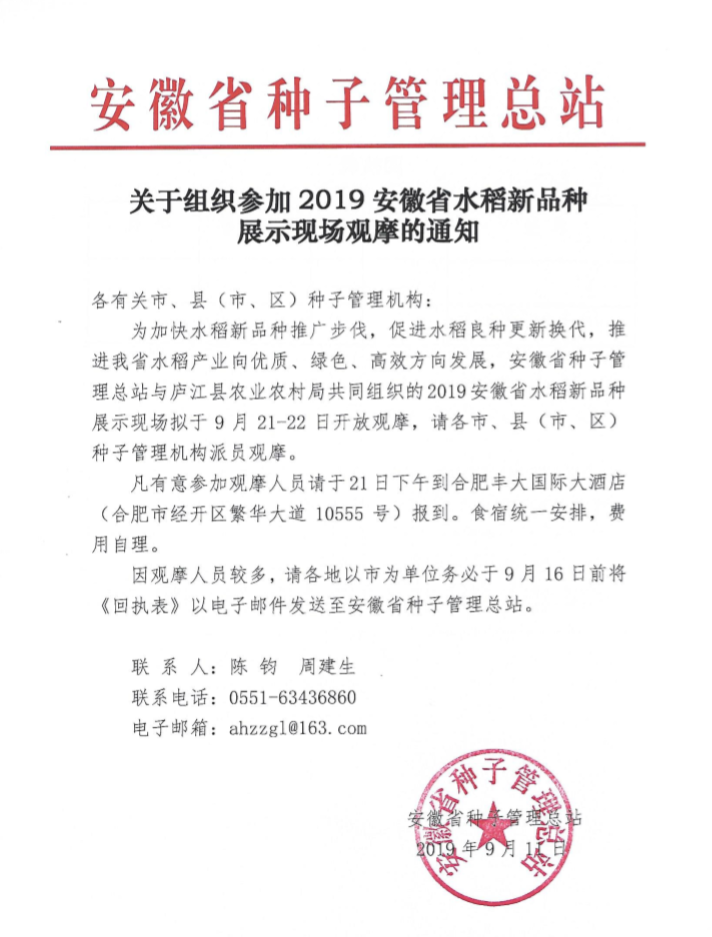 關于組織參加2019安徽省水稻新品種展示現場觀摩的通知