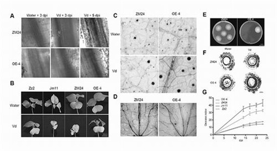 研究人員通過干涉GhARPL18A-6基因的表達,使得棉花對黃萎病菌(大麗輪枝菌)表現出敏感性,結合基因在病菌侵染下的表達模式,證實GhARPL18A-6參與棉花的抗病調控。轉基因植株的苗期抗黃萎病鑒定及連續兩年的病圃成株期抗病鑒定表明,GhARPL18A-6的過量表達能夠增強棉花的黃萎病抗性。進一步研究發現,在大麗輪枝菌侵染條件下,轉基因材料相對于受體材料,其木質部薄壁組織細胞壁的木質化及活性氧爆發均更為明顯,莖稈及根中大麗輪枝菌的定殖量更少,一些與抗病相關的標記基因表達量有更為明顯的上調表達。表達譜分析表明,轉基因材料在接種大麗輪枝菌后引起不同于對照組的細胞壁合成、木質素合成、蔗糖代謝等相關通路基因的上調表達。