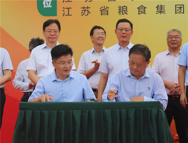 開幕式現場還舉行了簽約儀式。江蘇省糧食行業協會會長劉習東與江蘇神農大豐種業科技有限公司董事長周正紅簽署了優質水稻、專用小麥品質產銷戰略合作協議;揚州大學水稻產業工程技術研究院常務副院長高輝與江蘇神農大豐種業科技有限公司種業研究院院長王子明簽署了共建產業體系基地協議。