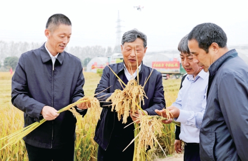 中國工程院院士張洪程(左二)帶領專家組開展測產工作。