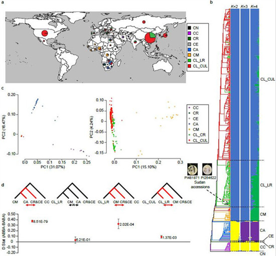 中國農科院深圳農業基因組研究所黃三文研究員介紹,其所在團隊協同鄭州果樹研究所、北京市農林科學院、美國康奈爾大學組成聯合攻關團隊,采用單分子測序、光學圖譜與Hi-C三維基因組聯合分析,完成了高質量的西瓜基因組序列圖譜。繼而對400多份種質資源開展了基因組變異分析,共鑒定近2000萬個SNP。在此基礎上,首次明確了西瓜7個種之間的進化關系,發現野生黏籽西瓜是距現代栽培西瓜親緣關系最近的種群,也發現了利用野生西瓜進行抗性改良的基因組痕跡。