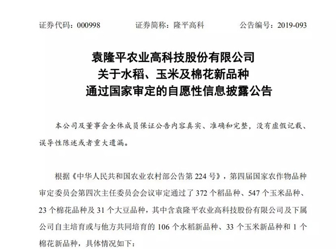 截至目前,隆平高科2019年獲得國家審定的水稻新品種數量較去年增長79.66%,玉米新品種數量(含今年3月獲得國家審定的新品種6個)較去年增長77.27%。