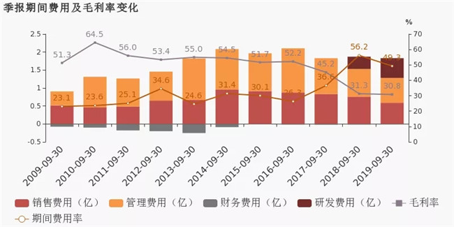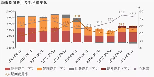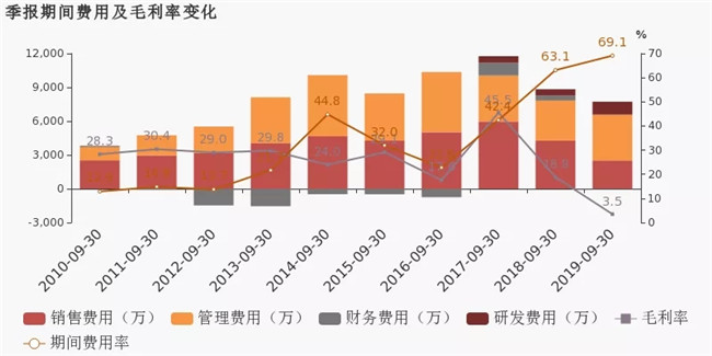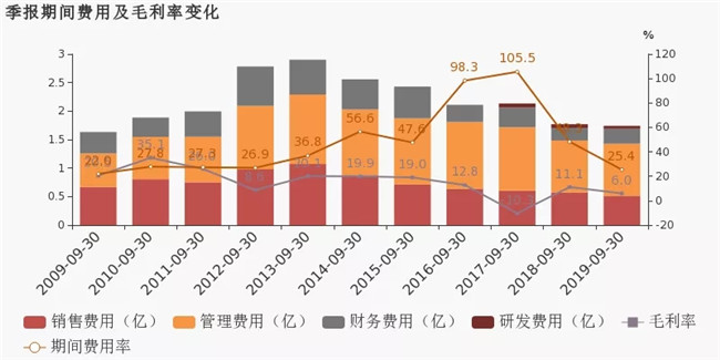 公司2019三季度營業成本1億,同比增長8.3%,高于營業收入4.8%的增速,導致毛利率下降1.9%。期間費用率為25.5%,較去年下降2.8%,費用控制合理。
