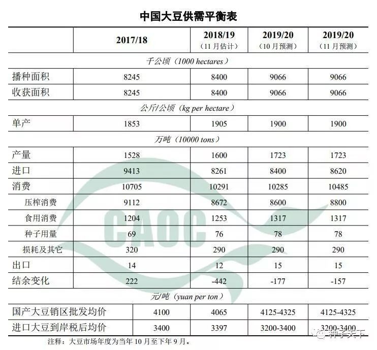 10月份,北方大部天氣晴好、光照充足,氣象條件有利于大豆成熟收曬,截止10月底,全國大豆收獲基本結束,東北產區新季大豆外觀、質量,特別是蛋白含量普遍好于上年,優質高蛋白新豆市場行情較好,按質定價明顯。本月預測,2019/20年度,中國大豆壓榨消費量8800萬噸,比上月預測數調增200萬噸,原因是受生豬生產恢復和禽類養殖旺盛影響,豆粕消費需求增加;受近期中美經貿磋商向好和未來中國大豆進口多元化影響,本月預測,2019/20年度,中國大豆進口量8620萬噸,比上月預測數調增220萬噸,比上年度增加359萬噸。本月對2019/20年度大豆生產和價格預測與上月保持一致。