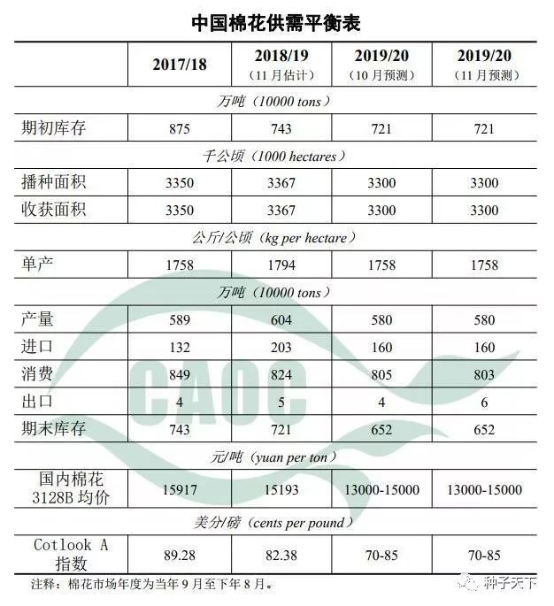 本月估計,2018/19年度棉花出口量累計5萬噸,比上月估計值增加1萬噸。棉花國內總消費量824萬噸,比上月估計值調減1萬噸。本月其他估計值與上月一致。