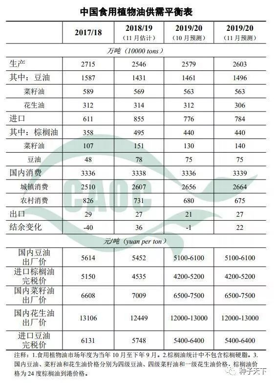 本月估計,2018/19年度,中國食用植物油產量2546萬噸,比上年度減少169萬噸。其中,受大豆、油菜籽進口量明顯減少的影響,豆油、菜籽油產量分別比上年度減少156萬噸、20萬噸;花生油增加2萬噸,其他植物油增加5萬噸。食用植物油進口量855萬噸,比上年度增加244萬噸。其中,棕櫚油、菜籽油、豆油、其他植物油分別增加137萬噸、44萬噸、30萬噸、33萬噸。出口量27萬噸,比上年度減少2萬噸。食用植物油國內消費量3338萬噸,比上年度增加2萬噸,主要是因為農村進城務工人數、農村居民收入比上年度均增加。