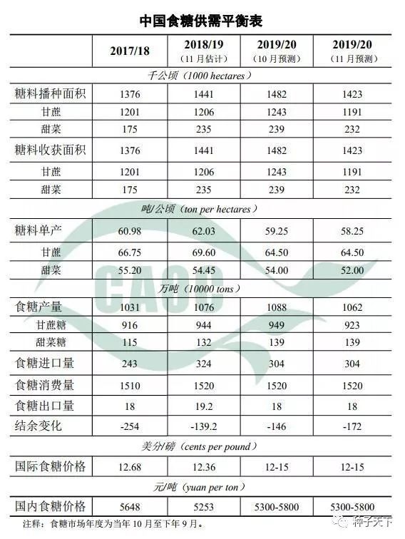 本月預計,2019/20年度糖料播種面積1423千公頃,比上月預測調減59千公頃;甜菜單產52噸/公頃,比上月預測調減2噸/公頃;食糖產量1062萬噸,比上月預測調減26萬噸,主要是受糖價低迷及不利天氣條件影響,導致糖料播種面積下降、廣西等部分甘蔗產區長勢偏差。近期,廣西等產區晝夜溫差較大,有利于糖分積累,可部分抵消因種植面積下降對產量的不利影響。本月對2019/20年度國內糖價暫不調整。