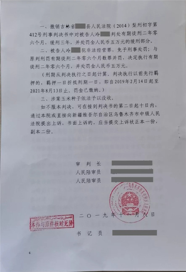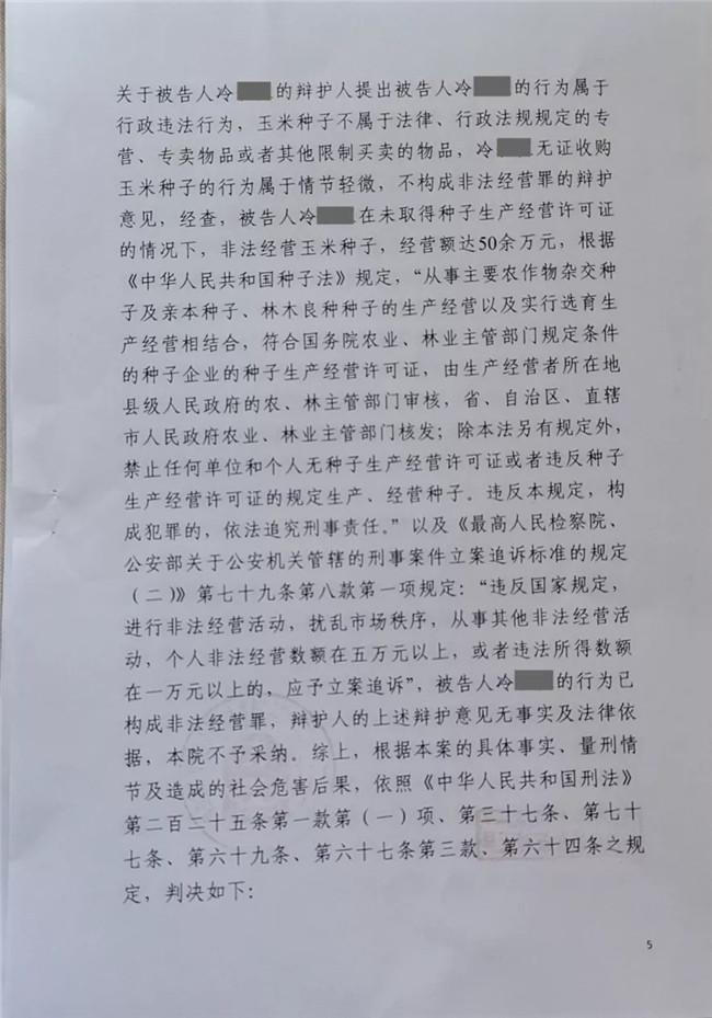 人民法院經審理認定,侵權人冷某的違法犯罪行為嚴重擾亂了種子生產經營的市場秩序,情節嚴重,構成非法經營罪。依法判處冷某有期徒刑二年零六個月,并處罰金人民幣五萬元,涉案玉米種子依法予以沒收。