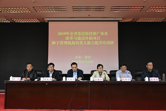11月21日至25日,2019年全省基層農技推廣體系改革與建設補助項目種子管理機構負責人能力提升培訓班在泰安舉辦。省農業農村廳科教處二級調研員沙繼紅、泰安市農業農村局局長姜士科出席開班儀式并致辭。省種子管理總站站長蔣慶功作總結發言。