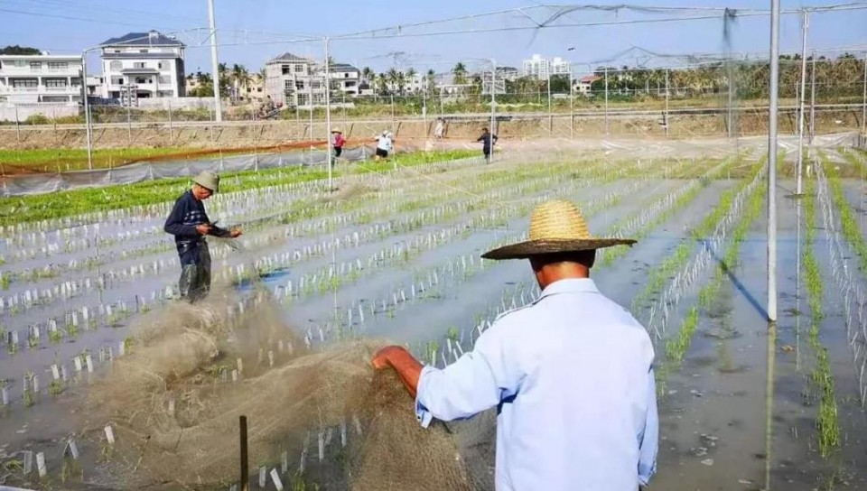 △12月10日,陵水安馬洋國家南繁科研育種基地,工作人員正在拉網防鳥。