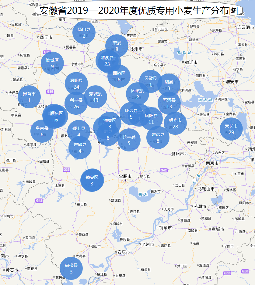 本分布圖僅展示全省307個單品種集中連片萬畝以上的種植單元,總種植面積646.65萬畝,占全省小麥播種面積的15%,其中最小種植面積1萬畝,最大種植面積8.1萬畝。集中連片5萬畝以上單品種種植單元41個,面積220.86萬畝,占全省小麥播種面積的5.1%。得益于安徽氣候多樣性,我省既有優質的強筋小麥種植(新麥26、煙農999等),也有優質的弱筋小麥種植(揚麥15等),更擁有適合大眾口味優質面條、饅頭、餃子等小麥品種植(煙農19、安農0711、渦麥9號等),種植面積較大的品種是:煙農19、渦麥9號、新麥26、華成3366、煙農999、荃麥725、揚麥15、鎮麥168、安農0711、鎮麥12等。