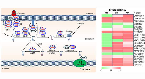 據劉文德研究員介紹,稻瘟病是世界范圍內嚴重威脅水稻安全生產的重要病害,時常發生局部或者大范圍的流行,造成農業生產重大損失。蛋白N-糖基化在內質網和高爾基體中進行,調節生命體蛋白質折疊、運輸等過程。然而,在植物病原真菌中,被N-糖基化修飾的大量蛋白還未被鑒定,其調控病原菌生長發育和致病過程的分子機制尚不清楚。研究人員使用定量修飾蛋白組學的策略,繪制了稻瘟病菌355個蛋白共559個位點的N-糖基化修飾圖譜,并發現參與細胞內質網質量控制系統的絕大部分蛋白均被鑒定為N-糖基化蛋白。深入分析揭示了該系統的關鍵蛋白編碼基因Gls1、 Gls2、GTB1和Cnx1對病原菌侵染循環的菌絲生長,分生孢子發育以及侵染菌絲擴展等過程均十分重要,而Gls1的糖基化修飾調控其蛋白穩定性和內質網定位,從而影響內質網質量控制系統的生物學功能。
