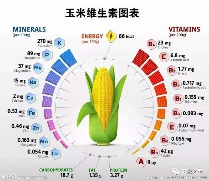 甜玉米富含維生素A、B1、B2、C、礦物質及游離氨基酸,兼具了糧、果、蔬三類食物的特性。由于低能量及豐富的營養,甜玉米也可作為減肥人群的理想配餐。