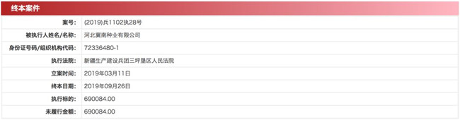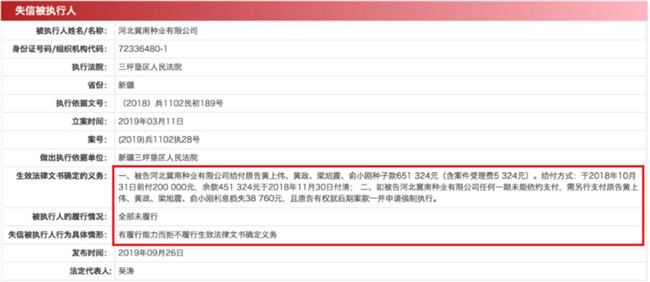 以河北冀南種業有限公司為例,據中國執行信息公開網公開信息顯示,該公司2019年3月11日立案至今仍有690084元的未履行金額,被列為失信被執行人。