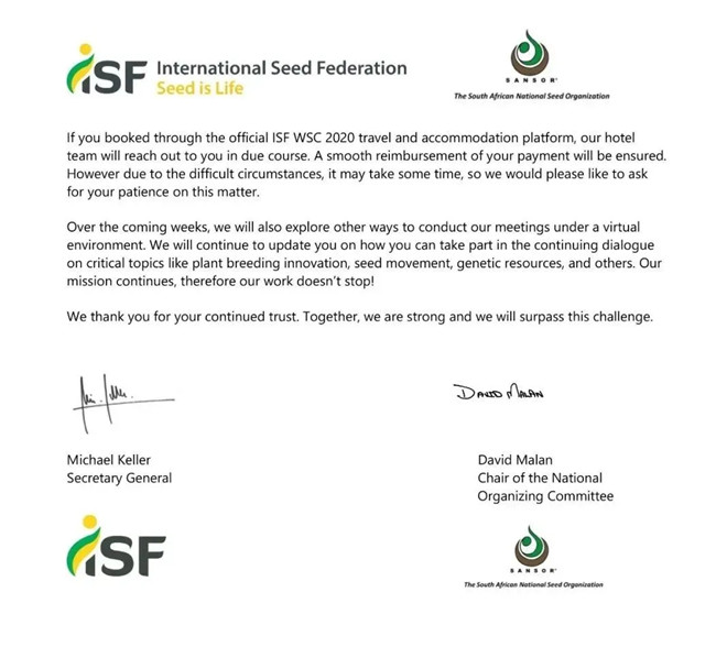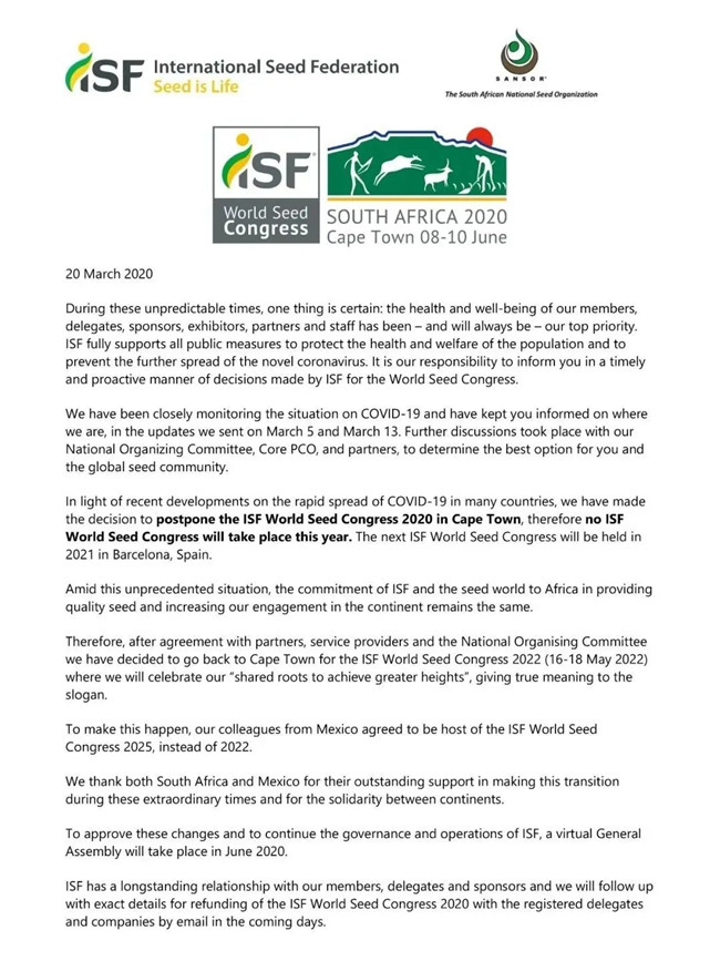 我們一直密切關注COVID-19的疫情情況,并在3月5日和3月13日發送的通知中告知了我們掌握的最新情況。經過與南非國家組委會、主要大會服務商以及合作伙伴的進一步討論,我們為您和全球種子產業做出了最好的選擇。