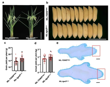 研究發現,親本培矮64s等位型基因在孕穗期穎殼中的轉錄水平顯著高于93-11等位型,穎殼細胞數目顯著減少。TGW2基因的啟動子區引起表達差異的關鍵位點,TGW2與調控細胞周期KRP1的基因組互作模塊,負調控水稻粒寬和粒重。
