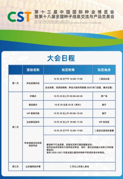 為進一步緩解新冠肺炎疫情給種子行業帶來的巨大影響,助力農業防災減災。全國種子雙交會組委會于疫期成功舉辦了CST疫情供需對接活動,透過于業內的種子企業、經銷商及種植大戶的充分溝通與交流,組委會擬于2020年10月29-30日在濟南·山東國際會展中心舉辦第十三屆中國國際種業博覽會暨第十八屆全國種子信息交流與產品交易會,并從以下幾個方面辦好大會,以此進一步幫助種子企業進行宣傳推廣,幫助種子經銷商獲取行業前沿資訊,尋求優質的品種。
