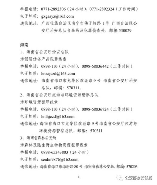 為確保農(nong)資打(da)假工作取得扎(zha)實(shi)成效(xiao),目(mu)前(qian),公(gong)安部食藥(yao)偵局將(jiang)全國各(ge)省級(ji)公(gong)安機關監督舉報方(fang)式予以公(gong)布(bu),歡迎(ying)廣(guang)大群眾(zhong)積極舉報相關違法(fa)犯罪活(huo)動線索。