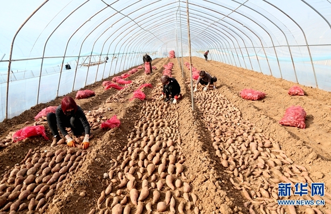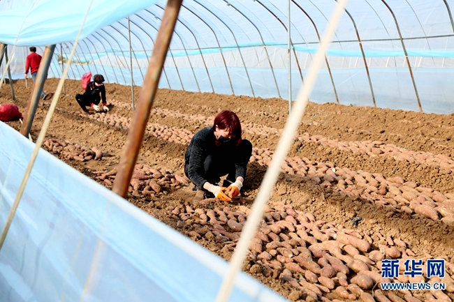 在河南省汝陽縣小店鎮小店村,家寶紅薯專業合作社的社員在育紅薯苗。