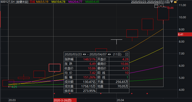 在3月30日至4月3日期間,金健米業就已經連續5漲停。至4月7日,金健米業已斬獲6連板。