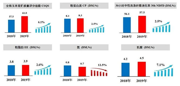 全株玉米青貯飼料質量達到良好水平。隨著糧改飼-優質青貯行動計劃實施,養殖者對青貯飼料認知程度有了很大提高,青貯飼料調制技術不斷改進,制作青貯飼料工作效率明顯提高,全株玉米青貯營養和發酵品質有了很大提升。2019年,我國全株玉米青貯飼料質量85%以上達到良好水平,其中,9%達到優級水平,CSQS平均值為61.0分,同比提高6.1%。其中,30小時中性洗滌纖維消化率(30hNDFD)和乳酸含量平均值比2018年分別提高了2.5%和7.1%,氨含量降低了12.5%,表明我國全株玉米青貯在田間收獲、調制和貯存管理等環節均得到改善。
