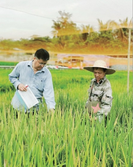 水稻攻關組秘書長、中國工程院院士胡培松(左)在南繁基地開展水稻科研育種工作。 資料圖