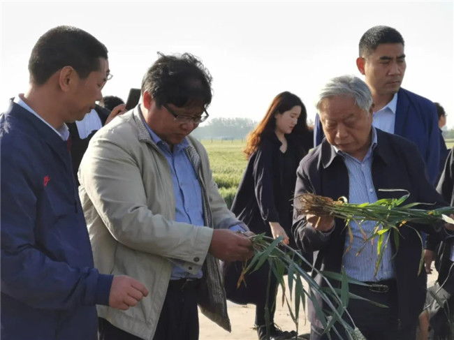郭天財教授和育種家殷貴鴻博士、高宏偉總經理在察看豫農908的長勢