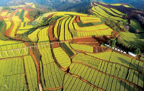 盛開的菜花綿延在王屋山區的淺山丘陵間。 資料圖