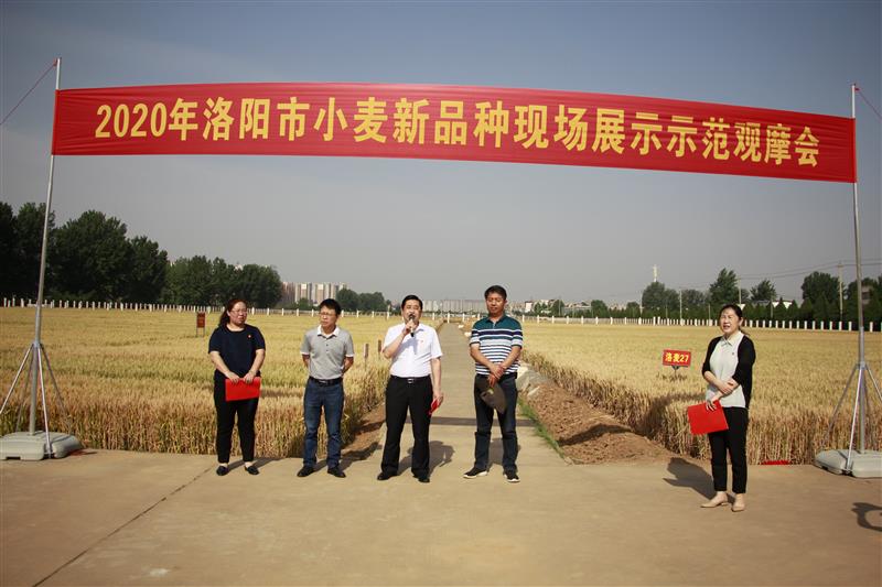 據了解,今年洛陽市共安排展示點8個,其中國家、省展示點2個,市級展示點6個。洛陽農林科學院為高水肥地,共展示小麥品種68個,其中水澆地品種59個、洛旱系列旱地品種9個;嵩縣展示點為具有灌溉條件的旱肥地,展示品種70個,此外偃師(40余個水澆地和當地小麥)、宜陽(優質強筋小麥)、洛寧(36個旱地品種)、高新區(40余個)均有示范小麥品種展示。洛陽市農業農村局相關科室負責人,市農林科學院小麥研究所、市農業技術推廣服務中心、市植物保護植物檢疫站、市種子管理站相關專家,以及各縣(市、區)農業農村局分管領導和種業負責人,部分種子企業和供種單位負責人、種子經銷大戶、種糧大戶等70余名代表參加觀摩會,參觀了洛陽農林科學研究院高水肥地、偃師市小麥繁種基地兩個示范點。洛陽農林科學院副院長趙保現致辭,會議由市農業農村局科教與種業管理科科長杜鵑主持。