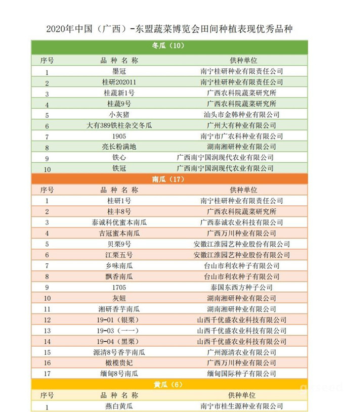 經組織有關專家評審,2020年中國(廣西)—東盟蔬菜新品種博覽會組委會公布了一批田間種植表現優秀品種(絲瓜、豆角、朝天椒未到成熟期),名單如下: