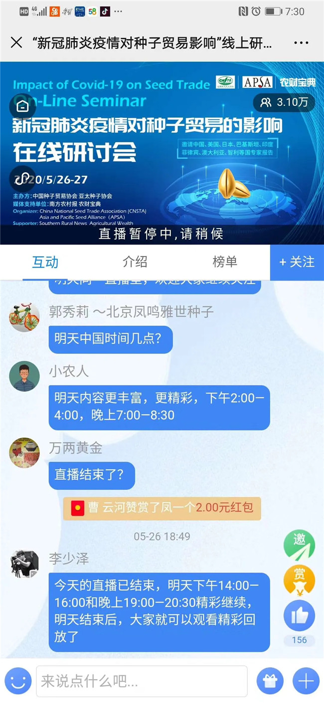 5月26日,新冠肺炎疫情對種子貿易的影響在線研討會拉開帷幕,來自中國、印度、巴基斯坦等國種業代表出席大會,對各國種業政策、疫情下面臨的挑戰、采取的措施及發展建議等進行精彩分享,各國種子公司代(dai)表也提出(chu)了(le)很多具體可行的建議。