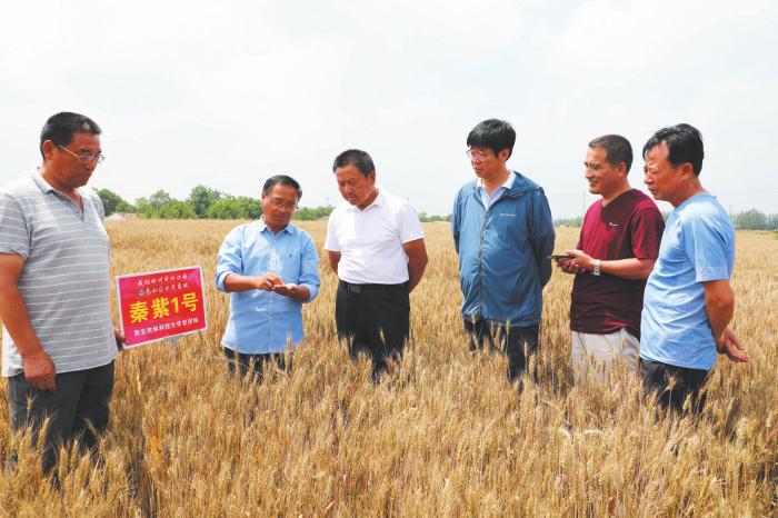 由西北農林科技大學農學院副院長胡寶倉帶領該院彩色小麥育種開發課題組專家,咸陽市農業技術推廣中心主任武明安帶領彬州市和永壽縣農業技術推廣中心專家,甘肅省平涼市農業科學院小麥所研究員任根深帶領其團隊從事彩色小麥育種的專家,共同組成了30多人的田間觀摩考察團,在彬州市水口鎮人民政府副鎮長李彬安及所建彩色小麥基地訂單收購企業(彬州務本堂豳禮農業有限公司、秦豐農業網絡有限公司、永壽縣鴻運達種養專業合作社聯合社、陜西唐農苑生態農業股份有限公司)等負責人的陪同下,對彬州市水口鎮和永壽縣即將收獲的900多畝旱地彩色小麥訂單種植基地進行了現場觀摩考察。