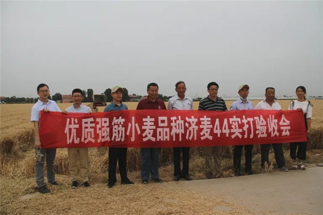來自中國農科院、中國科學院、石家莊市農林科學院、山東省種子管理總站、山東省農技推廣總站的5名專家組成的驗收專家組,按照農業農村部小麥高產創建產量測產驗收辦法,在位于壽光市化龍鎮欽西村的山東碧龍面業股份有限公司268畝濟麥44示范方,隨機抽取3塊田共機收4.39畝,平均畝產732.23公斤;在寒亭區高里街道橋西二村的濟麥44高產攻關田機收3.288畝,平均畝產766.62公斤,創全國超強筋小麥單產紀錄。