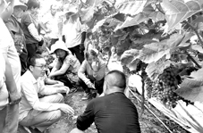 雷志強博士(shi)(戴(dai)眼鏡者)在葡萄園里為農(nong)戶指(zhi)導病蟲害防治(zhi)技術。(資料圖片)