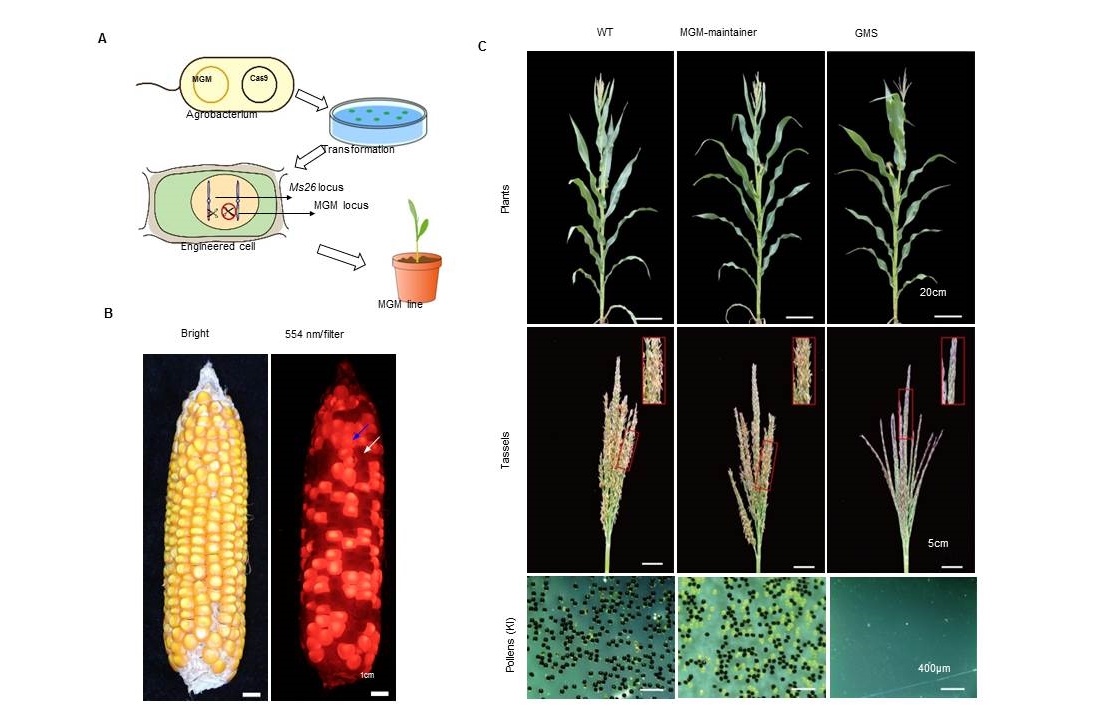 研究人員利用基因編輯技術對玉米育性基因的功能結構域進行了定點定向刪除,從而創制了核不育系,并巧妙地利用基因編輯技術精確性使之與保持系技術兼容,從而創制出操控型核不育保持系。
