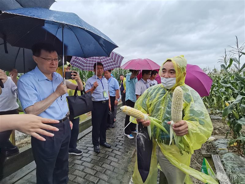 鄭洪建研究員(右)在鮮食玉米吳江綜合基地介紹中心團隊純白色甜玉米新品種申科甜516號
