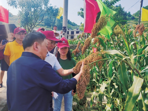 育種專家在仁懷市茅壩鎮官院村“紅纓子”育種基地察看紅高粱長勢。
