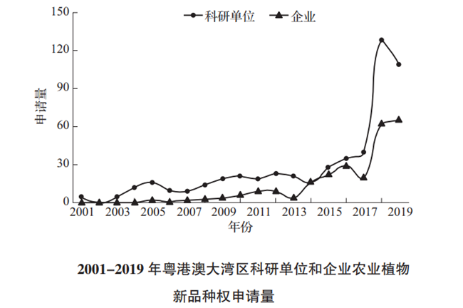 但與全國的情況稍有不同,粵港澳大灣區品種權申請單位主要是各級農科院、農業事業單位和農業高校等科研單位,企業僅在2014年與科研單位相持平。2014年以后,粵港澳大灣區種子企業的品種權申請數量雖然有所增加,但是依舊未超過科研單位。