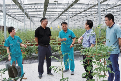 的技術人員向前來觀光的客人介紹他們新引進、采用吊蔓生長的新品