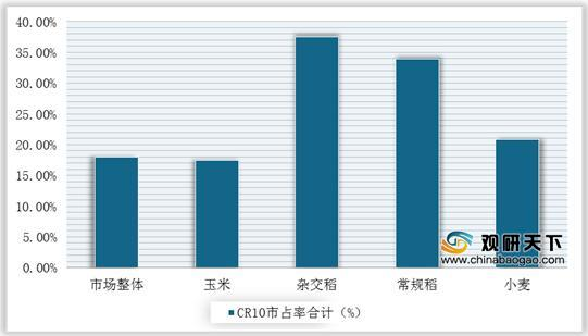 目前,我國種業市場集中度低,CR10市占率僅為18%,而全球CR10市占率已經高達60%,孟山都+拜耳市占率達到22%。在國內市場,若按作物分,水稻集中度較高,其中雜交稻37.46%,常規稻33.92%。