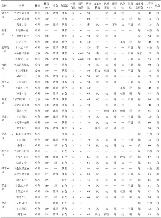 代表性芝麻雜交育成品種及其父母本的