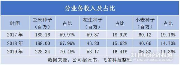 公司的主營業務收入主要來源于玉米種子、花生種子和小麥種子的銷售,三者的銷售收入占主營業務的比重報告期內均超過95%。