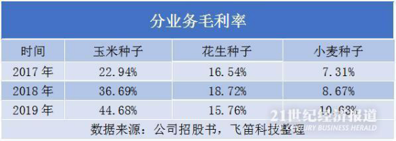 其中,玉米作為最主要的收入來源,2019年增長21.45%。花生種子在2018年因獲取政府的訂單數量下降,導致銷量下降。小麥種子的收入報告期內呈逐年下降的趨勢,公司解釋是近兩年調整小麥種子發展戰略。